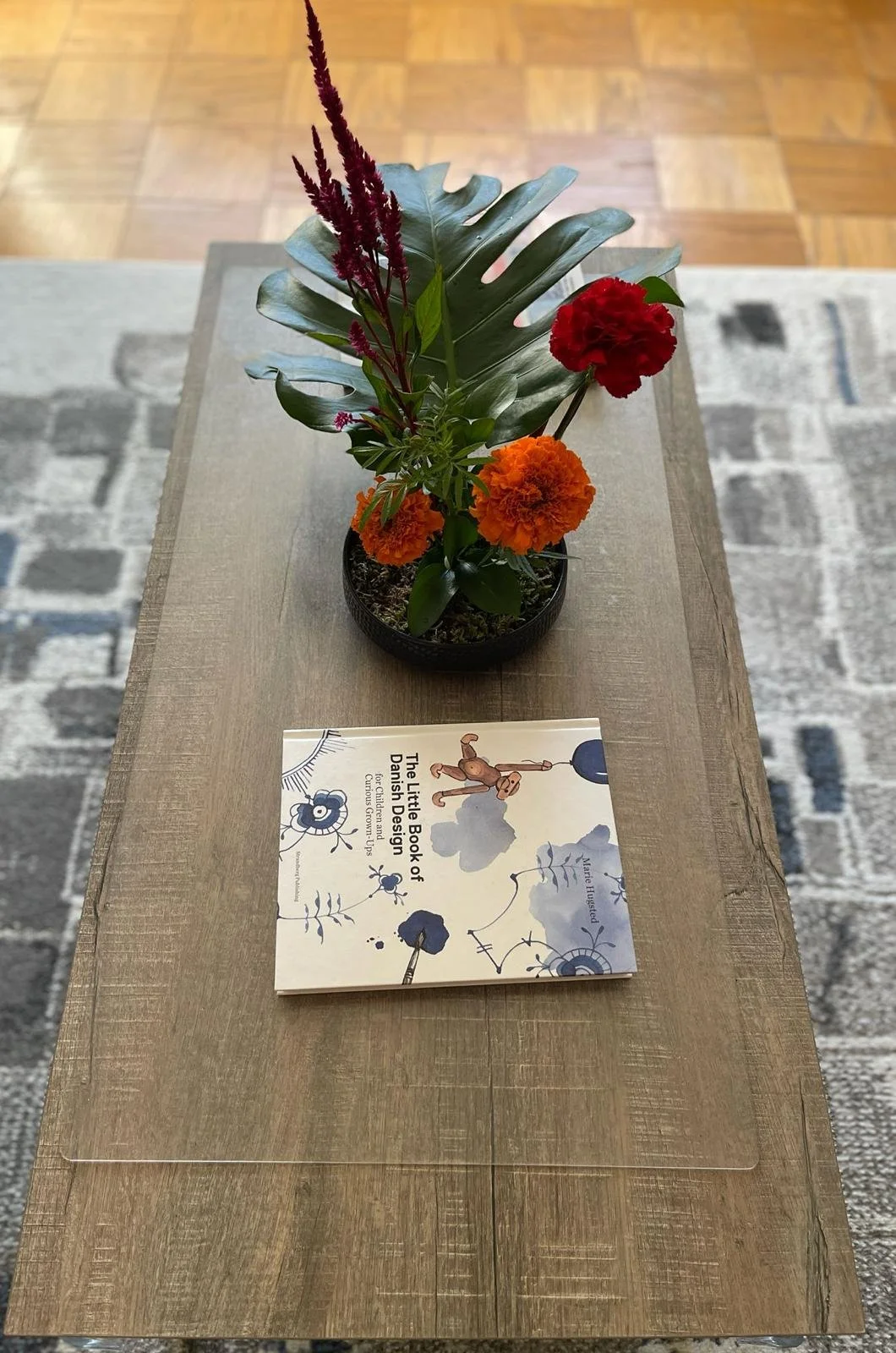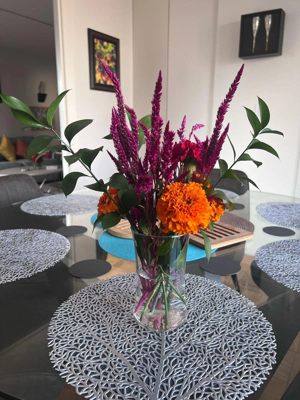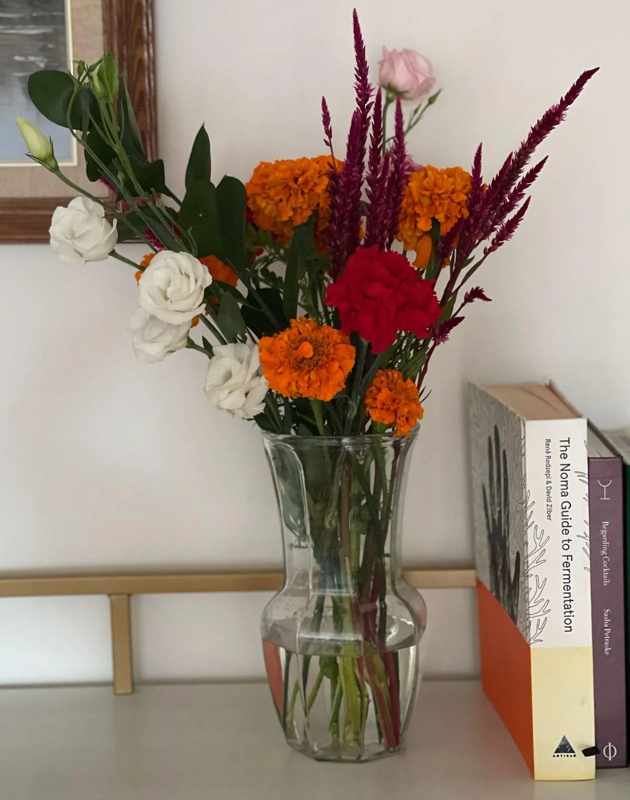 I wanted to bring home some flowers for Ganesh Chaturthi after a long, hot spell. It was the least I could do for the elephant-headed god, and I knew the flowers would last longer in the cooler temperatures. I chose a warm color palette of dominant reds and auspicious turmeric yellow for Lord Ganesh, with some greens for contrast. From my usual local flower vendor, I picked up marigolds, lisianthus, carnations, upright amaranthus, a Monstera leaf, and a few stalks of Italian ruscus.