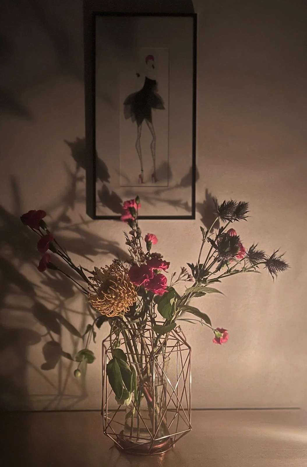 It was a Moribana style of Ikebana I had chosen subconsciously. Minimalistic in a shallow container with a kenzan. I liked the idea of creating beauty with sparseness. The only problem was, I did not have the tools or a shallow dish or a kenzan. The flowers were there but which ones should go in Moribana? And how can I do this without looking at some pictures of what is typical in a Moribana? ChatGPT was no help giving me pictures that could be zoomed. At least not the free version. ‘Way to go AI’, I sarcastically remarked to no one in particular. My pup looked at me questioningly as I spoke aloud.