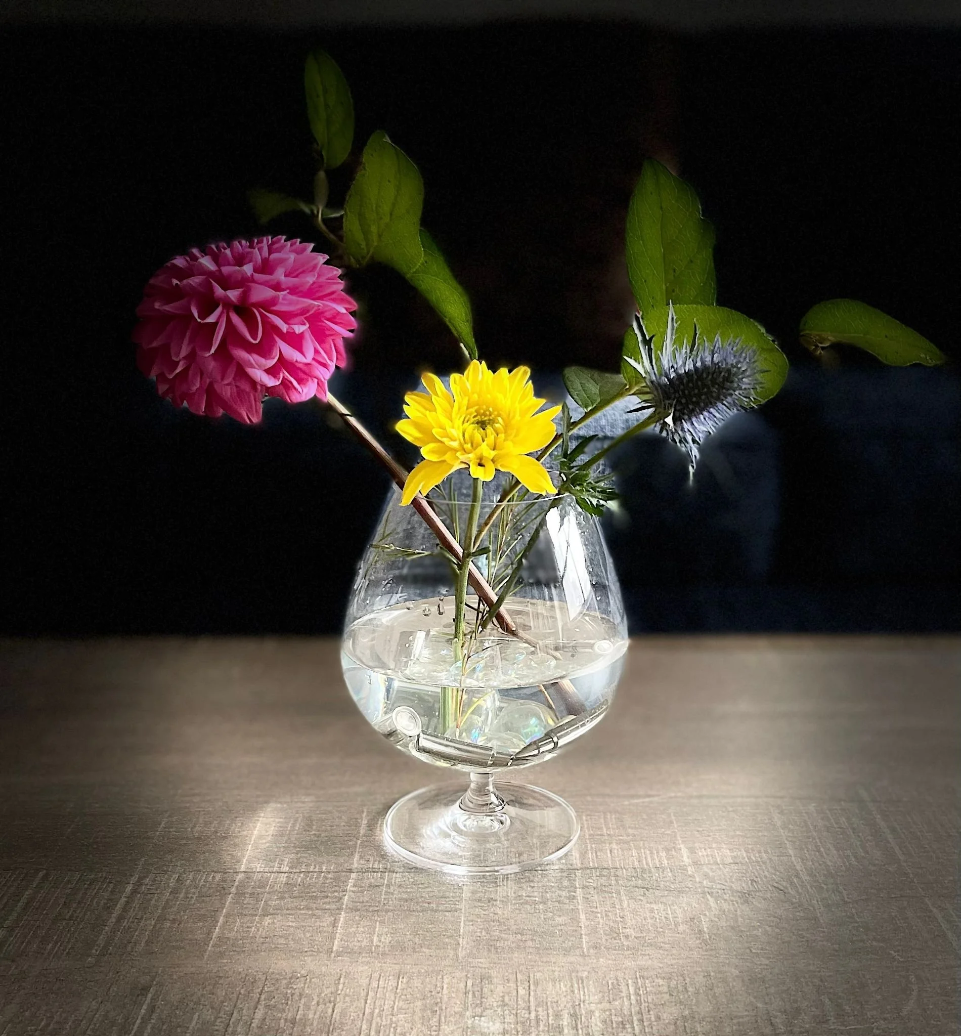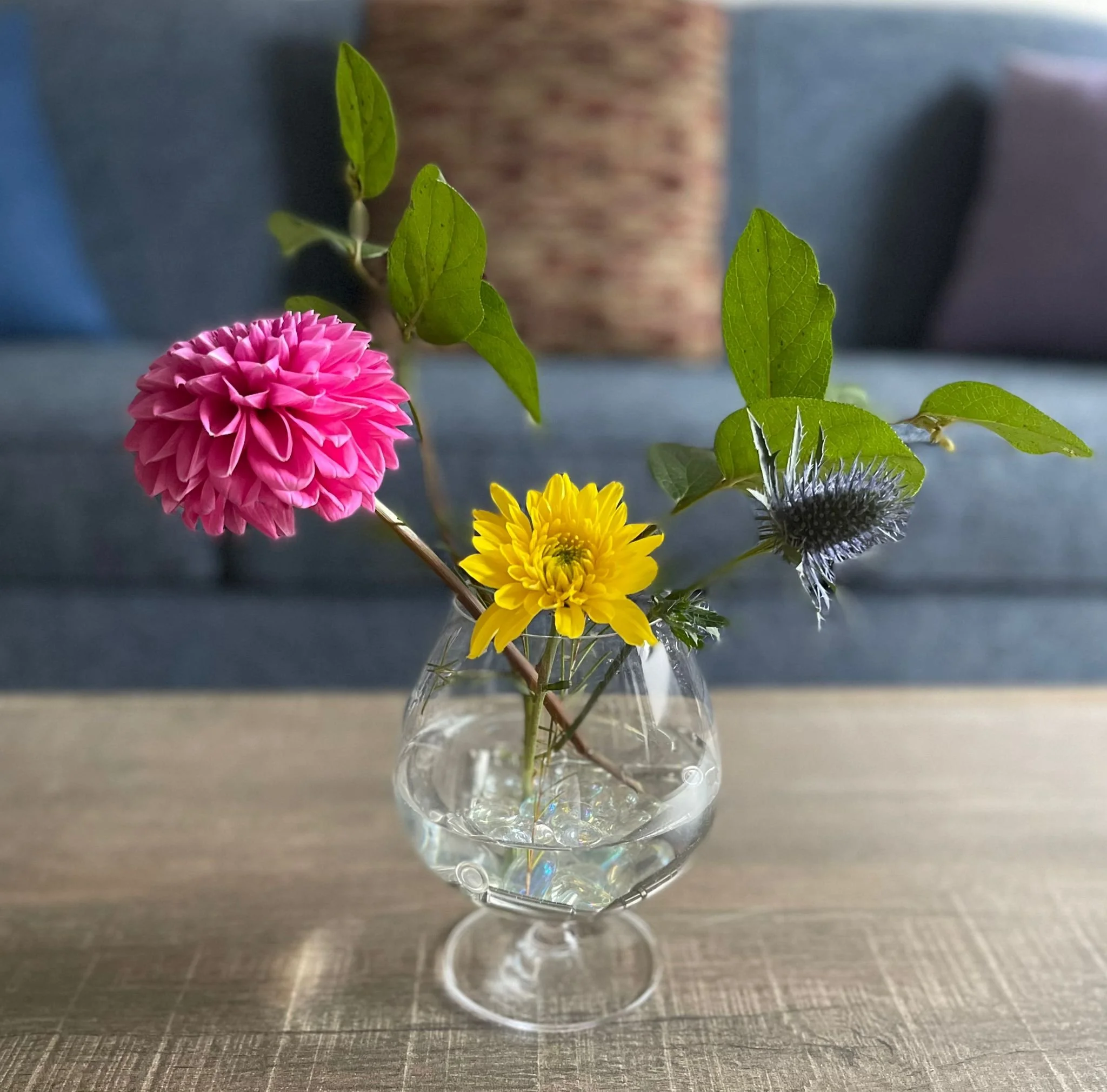 I struggled with the dilemma and the impulse to arrange flowers right away. They could not be left without water. And what if I lose interest in all this tomorrow? My unhelpful thoughts continued to swirl. I went from room to room, with my pup following me in tow. We halted every few steps, as my eyes searched for the right container. As I walked around searching, I remembered rustic but good ceramic pasta bowls I had thrown away a decade or so ago and wistfully longed for one of those right now. Unhelpful thoughts! I decided to create a sparse arrangement with three flowers and a green branch in a crystal snifter. The delicate snifter was carefully lined with glass marbles and steel fake slugs that had seen days cooling after-dinner drinks. It was not Moribana, I critically concluded, as I stared at the arrangement.