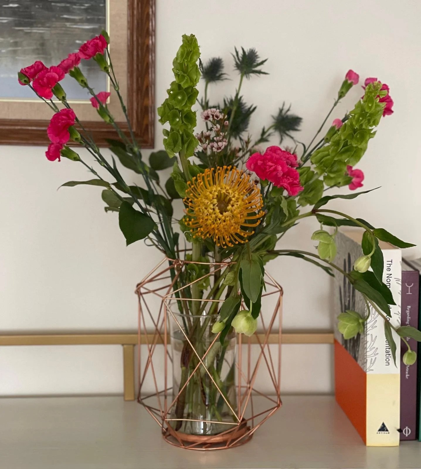 However, even as I created this mysterious arrangement, my eyes and heart looked for and finally settled on a small, ceramic hand-made pottery bowl that our newer friends had gifted us a few years ago. It was languishing on our entertainment console quite unused. I thought it had the perfect color, depth, and size. Now came the hard part – arranging flowers in it and making them stay without a kenzan! The marbles and cooling slugs were no help there. But certainly, Amazon was helpful, and an order was placed for a shallow vase and a kenzan over an espresso and napping puppy nearby.