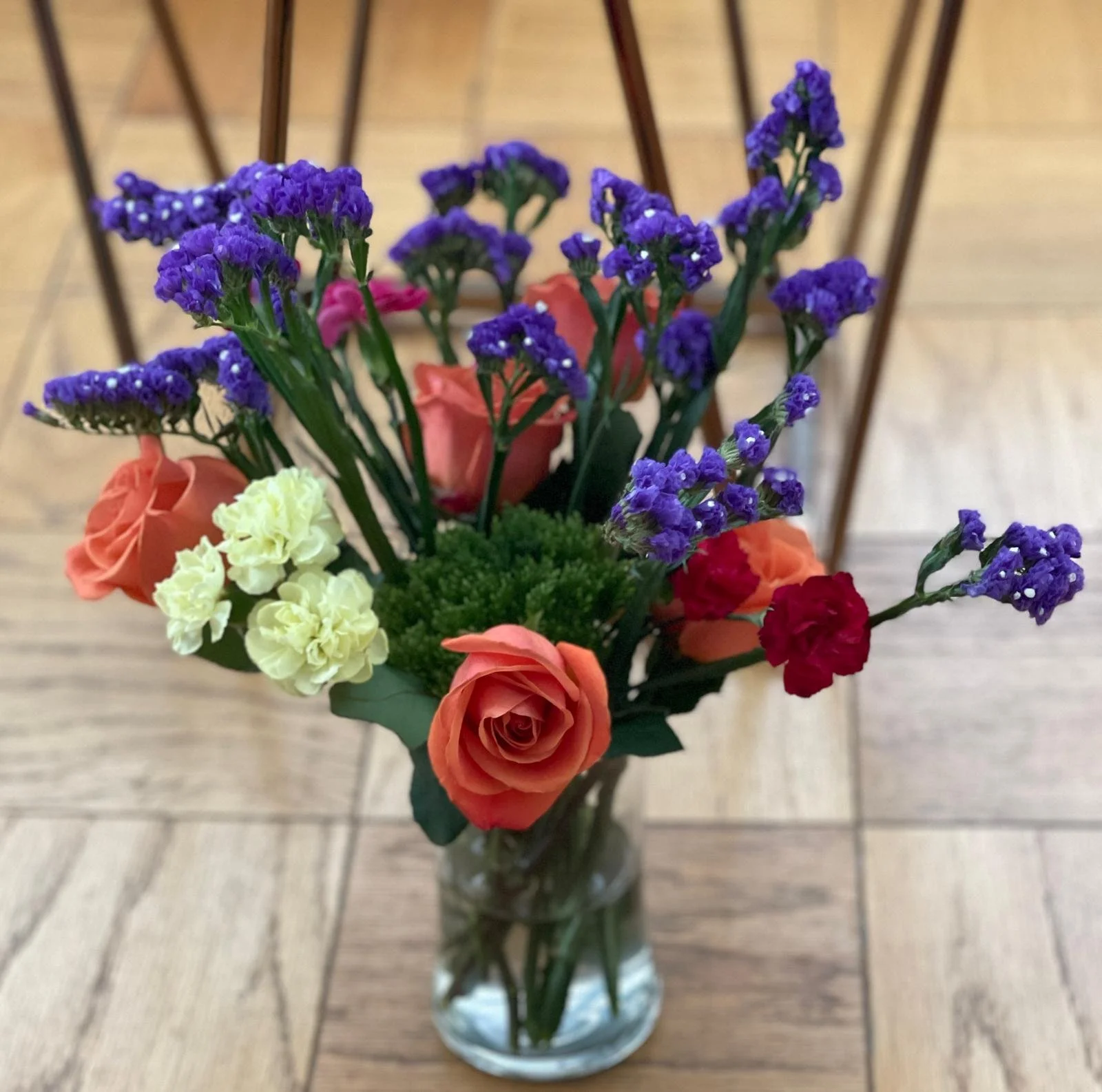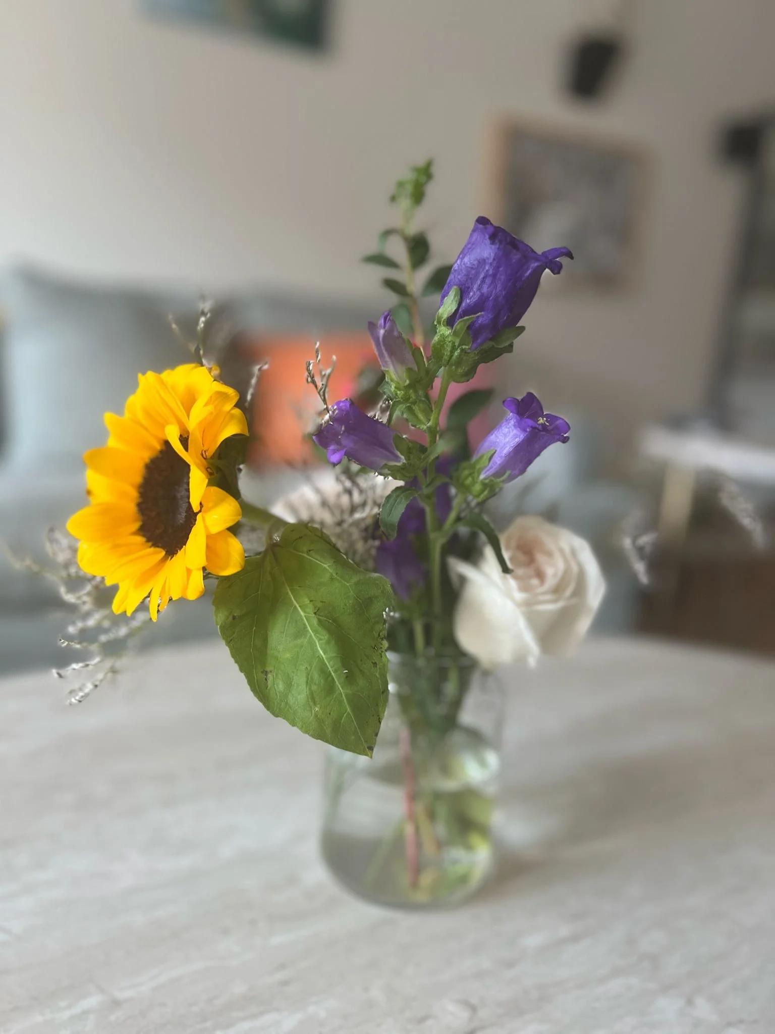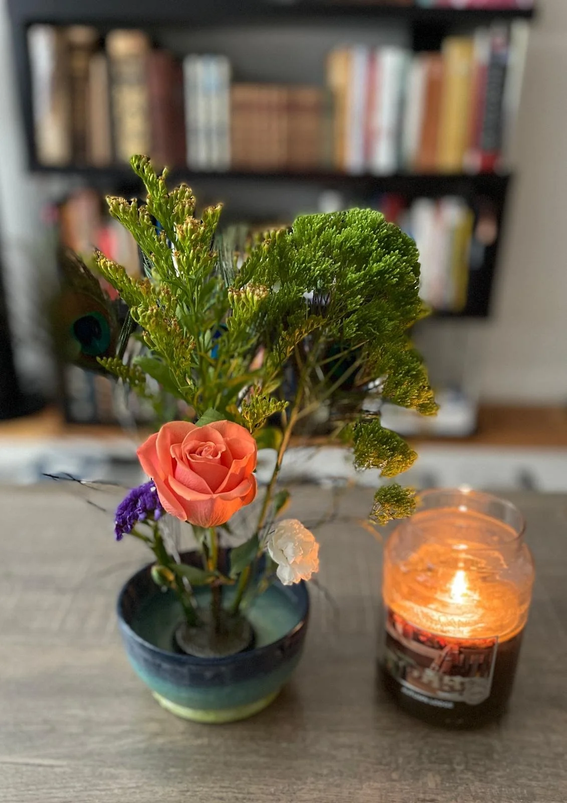 When it was time to replace them, I chose orange roses with purple statice. Unfortunately, these roses were all beauty and no scent. I paired the fresh flowers with green dianthus and yellow solidago from previous arrangements. These arrangements were short-lived, largely meant to warmly greet friends who visited us after many years. Our friends gifted me a gift card, and I promptly used it to buy the floral supplies I badly needed.