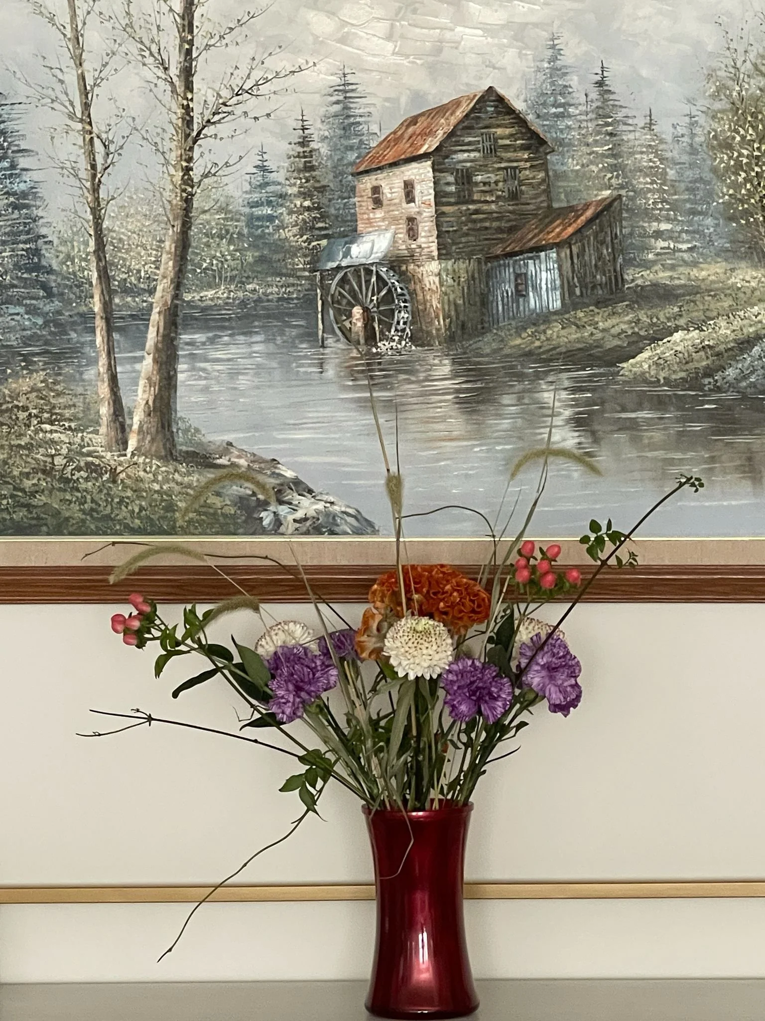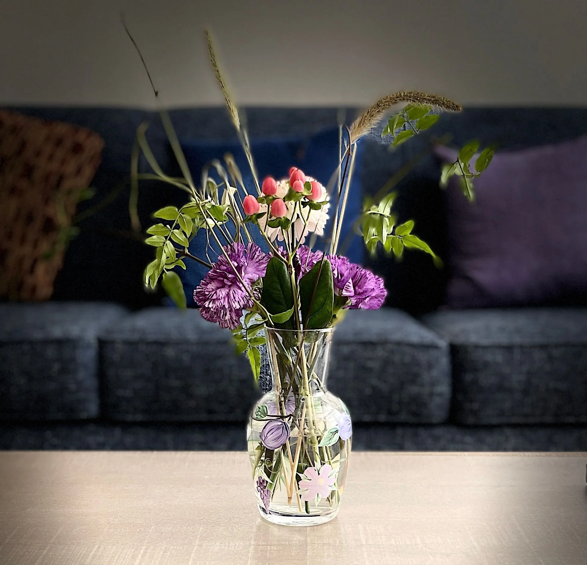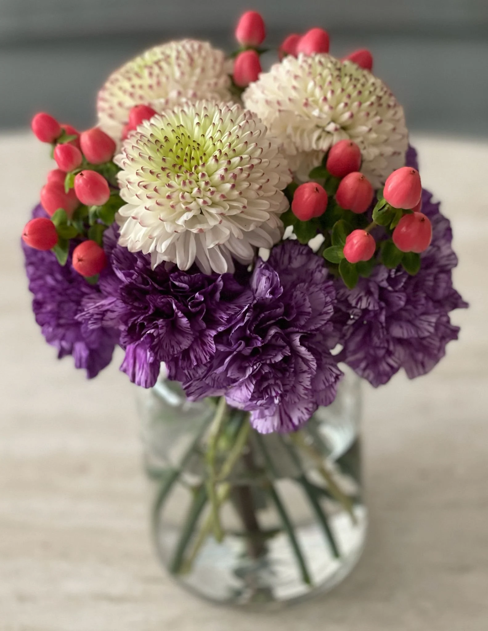 My second trip to the NYC Flower District was impromptu. I wanted fall flowers that bloomed in September with the colors in vogue for 2025, and I also wanted some stalks. I went to G-page, Abraflora Fresh Flowers, and Abraflora Dried Flowers. At G-page, I found white chrysanthemums with purple tips, pink hypericum berries, and jasmine vines that looked easy to carry. At Abraflora Fresh Flowers, I found indigo and white carnations and an orange celosia flower shaped like folded velvet. At Abraflora Dried Flowers, I found absolutely gorgeous Setaria stalks.