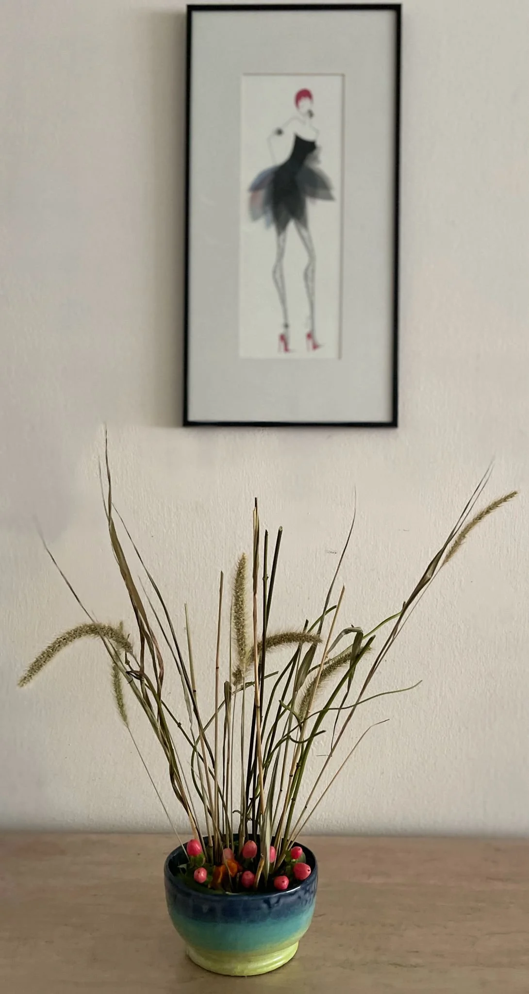 Arranging the first red vase took the lion's share of the time, as I rearranged the flowers at least five times. That experience taught me how the vines behaved in the vase. They certainly added beautiful movement and texture. However, I learned that if the vines are not fresh or if you don't know how to properly adapt them to your floral design, they can quickly turn into a disaster. None of the vases, except the rounded floral arrangement, could have come together without the Setaria stalks. The dry stalks were the star of the show; they merited their own vase. Dried, foliage-free jasmine vines were curved to form rough ellipses that provided support for the stalks. I created a beautiful silhouette image of the dried arrangement and texted it to Abraflora.